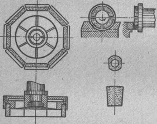 Круги больших диаметров для шлифования изготовляют составными из отдельных частей — брусков и сегментов, прикрепленных к металлическому диску (рис. 11). При работе такими кругами уменьшается выделение тепла, улучшается удаление пыли и мелкой стружки, образующихся при шлифовании, повышается безопасность шлифовальных работ.
