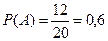 – событие, состоящее в том, что вынут белый шар. Общее число исходов 12+8=20, число случаев, благоприятных событию