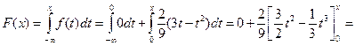2) Функция распределения случайной величины вычисляется как интеграл с переменным верхним пределом от плотности вероятности. Поскольку плотность вероятности является кусочно-непрерывной функцией, то интеграл с переменным верхним пределом вычисляется на каждом из промежутков