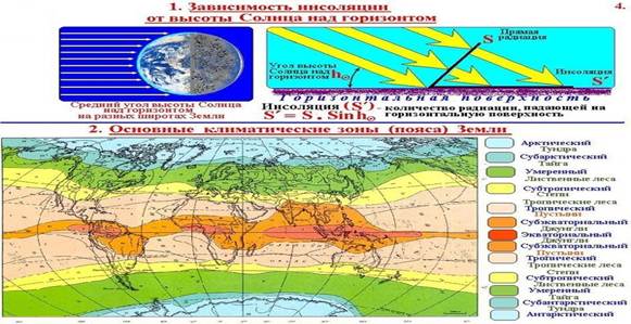 Максимальную. энергию получает поверхность, перпендикулярная солнечным лучам (экваториальные широты); чем больше наклон, тем меньше нагрев (полярные широты). Размещение природных зон находится в тесной взаимосвязи с климатическими поясами. Как и климатические пояса, они сменяют друг друга от экватора к полюсам в связи с уменьшением солнечного тепла, поступающего на поверхность Земли, и неравномерностью увлажнения. Такую смену природных зон называют широтной зональностью. Зональность проявляется во всех природных комплексах независимо от их размеров, а так же и во всех компонентах географической оболочки.