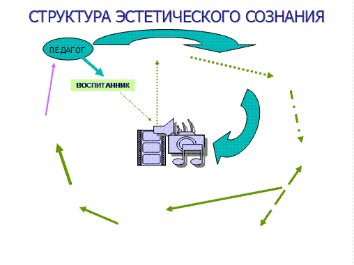 1. Эстетическое сознание человека формируется и совершенствуется на протяжении всей жизни. В рамках эстетического сознания можно выделить ряд функционально связанных и взаимозависимых элементов. Их взаимосвязь и функционирование в педагогическом процессе можно отразить в схеме: