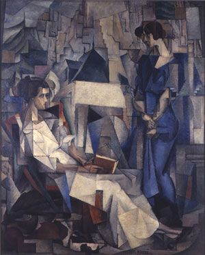 узнаваемые детали + кубистический метод. Горы и листва отчётливо читаются. Широта границ, доступных при введении кубизма. Преображение реальности по кубистическим законам, но есть узнаваемые элементы реальности.