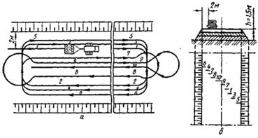 Уплотнение грунта прицепными катками выполняется на рабочей захватке по кольцевой схеме, а самоходными – по челночной схеме.