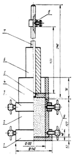 Рис. Схема прибора Союздорнии для стандартного уплотнения грунтов1 – поддон; 2 – разъемный цилиндр емкостью 1000 см3; 3 – кольцо; 4 – насадка; 5 – наковальня; 6 – груз массой 2,5 кг; 7 – направляющий стержень; 8 – ограничительное кольцо; 9 – зажимные винты.