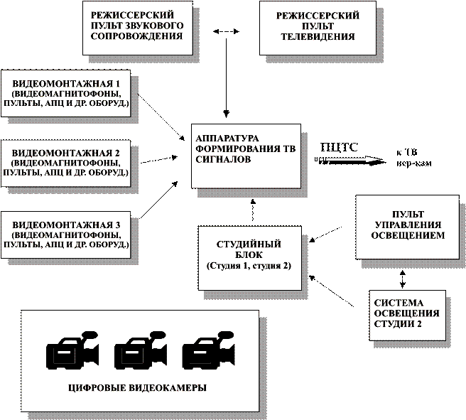 При формировании программы используются коммутаторы, микшеры, генераторы спецэффектов, системы электронной рирпроекции, телевизионные
