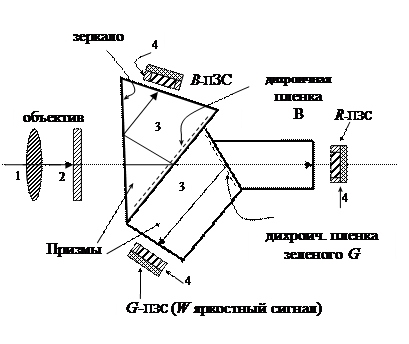 Рис. 14.2. Конструкция призменного цветоделительного блока: 1 - вариообъектив; 2 – нейтральный светофильтр; 3 – склеенные призмы;