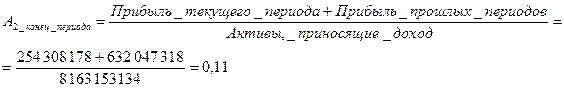 Коэффициент защищённости от риска А2. Характеризует предельную долю просроченной задолженности, которую банк может покрыть за счёт чистой прибыли, не подвергая риску привлечённые средства клиентов. Рекомендуемые значения не устанавливаются, целесообразно оценивать в динамике.