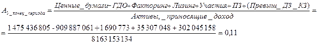 Уровень активов с повышенным риском А3. Характеризует долю активов с повышенным риском в доходных активах банка. К активам с повышенным риском относятся ценные бумаги (за исключением государственных долговых обязательств), факторинг, лизинг, участия, просроченная задолженность, превышение дебиторской задолженности над кредиторской). Рекомендуемые значения показателя не устанавливаются, целесообразно оценивать в динамике.
