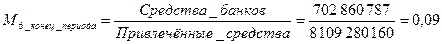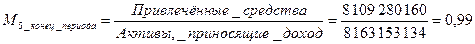 Коэффициент использования привлечённых средств М3. Предназначен для оценки осуществляемой банком политики в области управления пассивными операциями и показывает, какая часть привлечённых средств направлена в кредиты. М3_рекоменд=0,80. Если значение коэффициента превышает 0,80, то это может свидетельствовать о рискованной (агрессивной) политике банка.