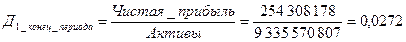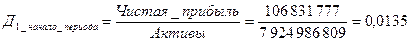 Коэффициент рентабельности активов Д1. Д1_рекоменд=0,0075-0,015. Для крупных банков характерны меньшие значения коэффициента. Низкая норма прибыли может быть результатом консервативной ссудной и инвестиционной политики, а также следствием чрезмерных операционных расходов. Высокое отношение прибыли к активам достигается при эффективной деятельности банка и больших ставках дохода от активов. В последнем случае банк, возможно, подвергает себя значительному риску. Однако также вероятно, что он удачно распоряжается своими активами, хотя при этом потенциально не исключены крупные потери.