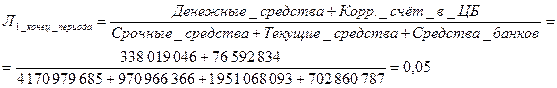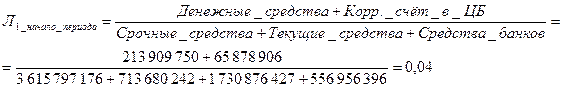 Коэффициент уровня «резервов первой очереди» Л1. Обозначает долю поступающих ресурсов, привлекаемых на срок и до востребования, обеспеченную первоклассными ликвидными средствами. Л1_рекоменд=0,03-0,07.