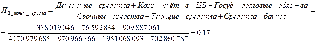 Коэффициент уровня «резервов второй очереди» Л2. Обозначает долю поступающих ресурсов, привлекаемых на срок и до востребования, обеспеченную средствами в распоряжении банка, которые могут быть немедленно превращены в денежные средства, и первоклассными ликвидными средствами. Л2_рекоменд=0,08-0,12.