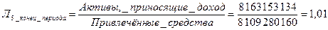 Коэффициент ликвидности Л4. Характеризует возможность банка одновременно погашать все его обязательства. Л4_рекоменд=0,15-0,20.