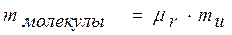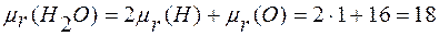 атома водорода равно 1, атома азота – 14, атома кислорода –16 и т.д. Относительная молекулярная масса молекулы равна сумме относительных атомных масс атомов ее слагающих. Например, для молекулы воды: