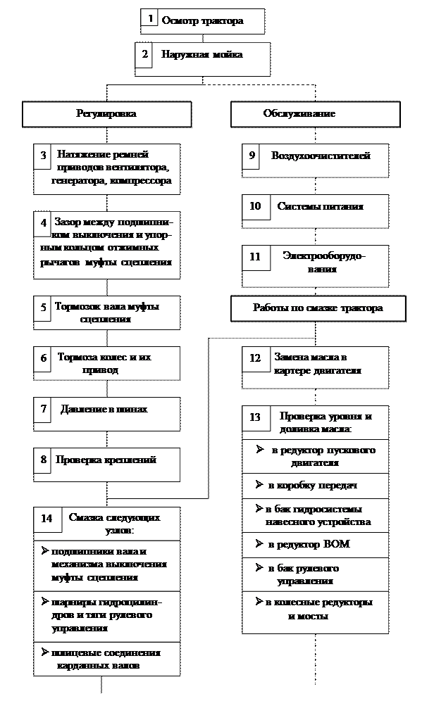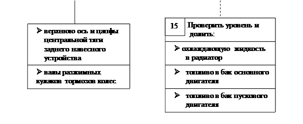 | Проверка уровня и доливка масла: | Редуктор пускового двига-теля: М10Г – до уровня контрольного отверстия. Коробка передач: летом М10Г, зимой М8Г – до середины масломерного стекла – доливать только через заправочный фильтр. Бак гидросистемы навесно-го устройства: летом М10Г, зимой М8Г – до середины масломерного стекла. Редуктор ВОМ: летом М10Г, зимой М8Г – до уровня контрольного отверстия. Бак рулевого управления: индустриальное 20 (вере-тенное 3) – до середины масломерного стекла. Колесные редукторы и мосты: трансмиссионное тракторное ТЭ-15ЭФО – до уровня контрольного отверстия. | Набор гаечных ключей. Масла М10Г, М8Г, индустри-альное 20 (ве-ретенное 3), ТЭ-15ЭФО. Ветошь. | ||