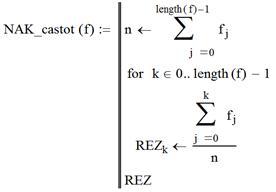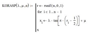 Процедура формирования массива случайных величин x, распределённых по закону Коши в MathCAD.