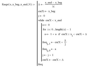 Процедура вычисления количества случайных величин из заданного массива х, попадающих на каждый из подинтервалов длиной