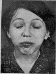 Рис. 6. Лицо Пациентка Г., 16 лет, в момент глотания: сокращение мимических мышц, движение век и бровей, резкое сокращение круговой мышцы рта и подбородочной мышцы («вид наперстка»); особенно регидны волокна круговой мышцы нижней губы, служащей опорой кончику языка при глотании.