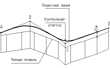 Проектную линию можно проектировать методом тангенсов. Для этого намечают на профиле контрольные точки и положение руководящих рабочих отметок. С помощью упругой линии или шаблонов вертикальных кривых графически намечают ориентировочное положение проектной линии. Ее заменяют отрезками прямых ABCD (рис. 3.12).