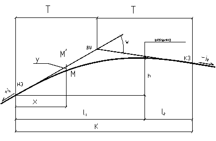 В переломы проектной линии вписывают вертикальные кривые. Расчет элементов кривых ведут исходя из схемы, представленной на рис. 3.13