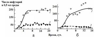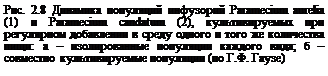 Не существует двух различных видов, занимающих одинаковые экологические ниши, но есть близкородственные виды, часто настолько сходные, что им требуется по существу одна и та же ниша. В этом случае, когда ниши частично перекрываются, возникает особо жесткая конкуренция, но в конечном итоге нишу занимает один вид. Эту особенность взаимодействия популяций наглядно иллюстрирует рис. 2.8 (а, б). На рис. 2.8 (а) представлена динамика развития популяций инфузорий Paramecium aurelia (кривая 1) и Paramecium candatum (кривая 2) по отдельности, а на рис. 2.8 (б) – динамика совместного развития. Из рис. 2.8 (б) следует, что при совместном развитии популяций численность первой (Paramecium aurelia) возрастает, а второй (Paramecium candatum) – уменьшается в результате угнетения со стороны первой. Явление экологического разобщения близкородственных (или сходных по иным признакам) видов получило название принципа конкурентного исключения, или принципа Гаузе.