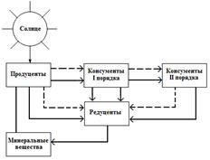 С точки зрения пищевых взаимодействий организмов трофическая структура экосистемы делится на два яруса: 1) верхний автотрофный ярус, или «зеленый пояс», включающий фотосинтезирующие организмы, создающие сложные органические молекулы из неорганически простых соединений, и 2) нижний гетеротрофный ярус, или «коричневый пояс» почв и осадков, в котором преобладает разложение отмерших органических веществ снова до простых минеральных образований. Однако, чтобы разобраться в сложных биологических взаимодействиях в экосистеме, следует выделить ряд компонентов, об экологической роли которых мы уже говорили выше: 1) неорганические вещества (С, N, СО2, Н2О, Р, О и др.), участвующие в круговоротах; 2) органические соединения (белки, углеводы, липиды (жиры), гумусовые вещества и др.), связывающие биотическую и абиотическую части; 3) воздушную, водную и субстратную среду, включающую абиотические факторы; 4) продуцентов – автотрофных организмов, в основном зеленых растений, способных производить пищу из простых неорганических веществ; 5) консументов, или фаготрофов (пожирателей), – гетеротрофы, в основном, животные, питающиеся другими организмами или частицами органического вещества; 6) редуцентов, или сапротрофов (питающихся гнилью), – гетеротрофных организмов, в основном бактерий и грибов, получающих энергию путем разложения отмершей или поглощения растворенной органики. Сапротрофы высвобождают неорганические элементы питания для продуцентов и, кроме того, являются пищей для консументов. Детали продуцирования и разложения органического вещества в природе приведено в Приложении 4, П.1.