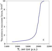 Все это приводит к мысли, что человек, как и любой биологический вид на Земле, так же приходящ и вовсе не является «вершиной эволюции», как часто думают сами люди. Тем не менее В. И. Вернадский полагал, что не для того природа потратила миллиарды лет, чтобы эпоха Homo sapiens просуществовала «мгновения», – это есть определенный «скачок» эволюции в весьма длительную новую геологическую эру. На рис. 5.2(а,б) представлена численность населения Земли и продолжи-тельность жизни человека в различные периоды времени. Значения N выше 2014 г. представляют собой результаты прогноза.