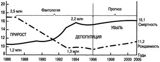 ВРоссии, за последние более чем 10 лет, с начала перехода на так называемую «рыночную экономику», демографическая ситуация стала критической: смертность стала превышать рождаемость в среднем по стране в 1,7 раза, а в 2000 г. ее превышение достигло двух раз. Сейчас население России убывает ежегодно на 0,7–0,8 млн. человек. По прогнозу Госкомстата России и Центра демографии и экологии человека Института народнохозяйственного прогнозирования РАН, к 2050 г. население России сократится на 51 млн. человек, или на 35,6% по сравнению с 2000 г., и составит 94 млн. человек.
