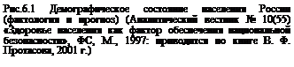 В 1995 г. в России был зарегистрирован один из самых низких в мире показателей рождаемости – 9,2 младенца на 1000 человек, в то время как в 1987 г. он составлял 17,2 (в США 16 младенцев на 1000 человек). Для простого воспроизводства населения необходимо, чтобы коэффициент рождаемости на одну семью составлял 2,14 – 2,15, а в нашей стране на сегодня он равен 1,4, т. е. налицо процесс сокращения численности человеческой популяции (явление депопуляции) вРоссии. Естественное движение населения России: состояние и прогноз (в промилле, т. е. прибыль и убыль населения в количестве человек, приходящихся на 1000 жителей) приведено на рис. 6.1 (подробнее см. Приложения 7, П.3.).