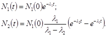 где l1, l2 ¾ постоянные распада соответствующих ядер. Предполагая, что в начальный момент времени t = 0 N 2(0) = 0, а N 1(0) ¹ 0, разрешая систему, получаем: