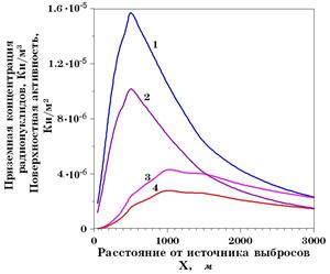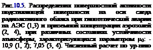 Типичные распределения приземной объемной активности радиоактивных аэрозолей, графики которых приводятся на рис.10.5, характеризуются наличием максимума, расположение которого в зависимости от состояния устойчивости атмосферы и характеристик выброса изменяется от нескольких сот метров до 1500 м. Аналогичное приземное распределение объемной активности радиоактивной газоаэрозольной примеси для тех же характеристик выброса и состояний устойчивости атмосферы будет иметь место и в факеле выброса продолжительностью не менее получаса.