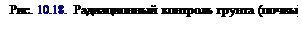Радиационный контроль грунта (почвы) производится с применением пробоотборного и дистанционного методов радиационного контроля (рис. 10.18). Точки отбора проб располагаются в СЗЗ, ЗН и в контрольном пункте на ровных горизонтальных участках открытой местности. Пробы отбираются на целинных участках не подверженных эрозии почвы, расположенных вне поймы рек, в удаленных от дорог.