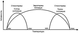 Относительно действия одного фактора можно проиллюстрировать этот закон так: некий организм способен существовать при температуре от минус 5 до плюс 25 °С, т. е. диапазон его толерантности лежит в пределах этих температур. Организмы, для жизни которых требуются условия, ограниченные узким диапазоном толерантности по величине температуры, называют стенотермными («стено» – узкий), а способные жить в широком диапазоне температур – эвритермными («эври» – широкий) (рис. П.2.1).