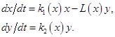 В модель заложены следующие предположения: 1) Хищники не взаимодействуют друг с другом, т.е. коэффициент размножения хищников k 2 и число жертв L, истребляемых в единицу времени одним хищником, не зависит от y. 2) Прирост числа жертв при наличии хищников равен приросту в отсутствие хищников минус число жертв, истребляемых хищниками. Функции k 1(x), k 2(x), L (x), - непрерывны и определены на положительной полуоси x,y, 0. 3) dk 1/ dx < 0. Это означает, что коэффициент размножения жертв в отсутствие хищника монотонно убывает с возрастанием численности жертв, что отражает ограниченость пищевых и иных ресурсов. 4) dk 2/ dx > 0, k 2(0) < 0 < k 1(¥). С ростом численности жертв коэффициент размножения хищников монотонно возрастает, переходя от отрицательных значений, (когда нечем питаться) к положительным. 5) Число жертв, истребляемых од-