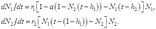 Здесь N 1 = N 1(t), N 2 = N 2(t) - нормированные количества имаго и личинок, h 1 - время между по-