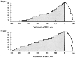 | Рис.П.6.1. Общая численность и возрастной состав населения развивающихся и развитых стран (соответственно заштрихованные и незаштрихованные части диаграммы слева и справа). Верхняя диаграмма соответствует состоянию на 1980 г., а нижняя – прогнозу ООН на 2000 г. |