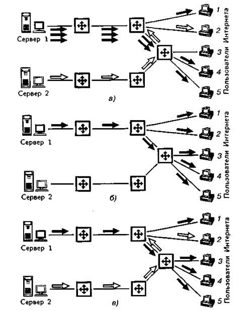 В приведенном на рисунке примере пользователи 1, 3, 4 и 5 запросили информацию с сервера 1, в результате чего получают ее в режиме «мультивещания». Для реализации такого режима в некоторых узлах обеспечивается не только маршрутизация, но и размножение пакетов информации и распространение их среди пользователей – участников группы «мультивещания». В этих же узлах, как видно из рисунка, могут быть аналогично созданы условия для распространения информации тем же получателям, но уже с сервера 2. Такой переход от одного источника информации к другому, при неизменном составе получателей, может быть осуществлен для них незаметно.