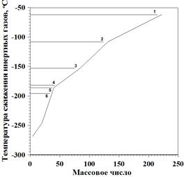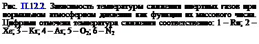 Если радиоактивные аэрозоли могут быть задержаны путем усовершенствования методов фильтрации, то задержка ИРГ оказывается достаточно трудоемкой в силу особых их физико-химических свойств, требуя специальных технологий. Вместе с тем, используя известные технологии сжижения газов при низких температурах и, основываясь на том, что разные ИРГ имеют различную температуру, при которой они превращаются в жидкость* (см. рис. П.12.2), а также учитывая тот факт, что выбросы газоаэрозольной радиоактивной примеси в атмосферу на рассматриваемых производствах осуществляются не равномерно (в сутки, месяц, год), а имеют залповый характер, то, ограничивая время выброса и направляя в заданный период времени воздушный поток, загрязненный газоаэрозольной радиоактивной примесью, в установку сжижения газов, можно добиться как разделения ИРГ от воздуха, так и выделения радиоактивных аэрозолей.
