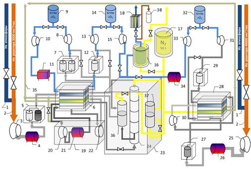 | 1. Подводящий трубопровод из атмосферы; 2. Подводящий трубопровод из реактора; 3. I компрессор низкого давления; 4. I блок предварительного охлажде-ния воздуха с ИРГ; 5. I блок комплексной очистки (БКО); 6. I многопоточный теплообменник; 7. I блок переключающихся адсорберов; 8. I вакуумный насос; 9. I газгольдер; 10. II компрессор низкого давления; 11. Охладитель воздуха с ИРГ; 12. II блок адсорбции; | 13. II вакуумный насос; 14. II газгольдер; 15. III компрессор низкого давления; 16. хранилище выделенных ИРГ; 17. криогенный сосуд – хранилище жидкого азота; 18. испаритель атмосферный; 19. Рефрижератор замкнутого цикла; 20. Компрессор рефрижератора; 21. Блок предварительного охлаждения рефрижератора; 22. I турбодетандер; 23. Блок ректификации; 24. Колонна ректификации для КС ППР; 25. компрессор среднего давления; 26. II блок предварительного охлаждения воздуха с ИРГ; | 27. II блок комплексной очистки (БКО); 28. II многопоточный теплообменник; 29. Блок адсорбера КС ППР; 30. II турбодетандер; 31. III вакуумный насос; 32. III газгольдер; 33. IV компрессор низкого давления; 34. III теплообменник; 35. трубопровод выброса очищенного от ИРГ воздуха в атмосферу; 36. Переохладитель кубовой жидкости; 37. Переохладитель жидкого азота; 38. баллон с гелием |