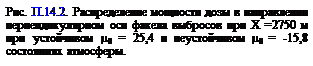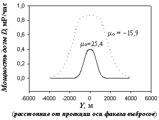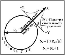 На подстилающей поверхности рассчитывают распределение мощности дозы в направлении перпендикулярном к радиусу, считая, что в максимуме распределения, т.е. на границе зоны по радиусу и достигается предельно допустимая мощность дозы. В полученном распределении находят расстояние, на котором мощность дозы оказывается равной порогу чувствительности датчика (D′ g)min. Если это расстояние d, то необходимое число датчиков определится целой частью отношения Nн = [2pr/2d] = [pR/d], а достаточное - на единицу больше Nд = Nн + 1. Значение Nн при классе устойчивости F равно 22 ¾ 24. При ином классе устойчивости (например, А), когда скорость переноса невелика, но значительна поперечная диффузия примесей, при неизменных остальных параметрах выброса (мощность выброса, нуклидный состав) Nн = 14 ¾16, что нетрудно понять из рис. П.14.2. Таким образом, наименьшее число датчиков, размещаемых в санитарно-защитной зоне и регистрирующих факел выбросов при любом направлении ветра, для класса устойчивости не ниже F должно отвечать наихудшим условиям и составляять 22 ¾ 25. Следует отметить при этом, что с повышением чувствительности датчика, т.е. с уменьшением порога до 0,01 мкЗв/ч (последнее может быть получено за счет повышения чувствительности непосредственно регистрирующего элемента и путем вычитания радиационного фона) значение d увеличится, а Nн уменьшится без потери чувствительности системы в целом (наглядный пример того, как повышение качества дает количественный результат). Таким образом, оптимизация числа датчиков АСКРО, размещаемых на промплощадке и в СЗЗ устраняет противоречия между экологическими и экономическими требованиями, которые предъявляются к автоматизированным системам радиационного контроля внешней среды.