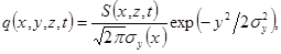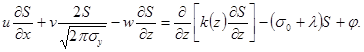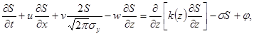 Рассматривая в качестве субстанции объемную активность радиоактивной примеси, при определенных метеопараметрах u (z), v (z) и k (z) перенос последней в атмосфере рассчитывают, используя уравнение турбулентной диффузии. При этом формулируют задачу следующим образом. Предполагают, что размывание примеси по оси Y осуществляется по закону Гаусса, определяя, таким образом объемную активность примеси выражением: