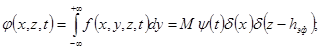 f = M y (t) d(x)d(y)d(z-hэф) – источник радиоактивной примеси; M – мощность выброса Бк/с; h эф – эффективная высота выброса; y(t)–изменение при выбросе объемной активности радиоактивной примеси во времени. В качестве постоянной релаксации радиоактивной примеси s будем рассматривать величину, представляющую собой сумму постоянной вымывания примеси из атмосферы s0 и постоянной ее радиоактивного распада l, так что s = s0 + l. В рамках рассматриваемой модели переноса величину