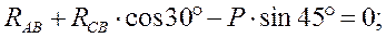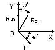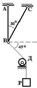 Рис. 1.1. Стержневая конструкция | Определить реакции в стержнях АВ и СВ (рис. 1.1.), если Р = 1500 Н; ________________________ ? ? |