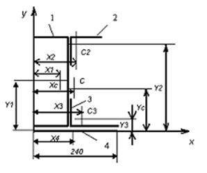 Рис. 4.1. Схема составного сечения | Определить координаты центра тяжести сечения (рис. 4.1.) составленного из: 1 – швеллера №30; 2 – равнополочного уголка 100 100 12; 3 - неравнополочного уголка 140 90 10; 4 – стального листа сечением 240 10 мм. ___________________________ |