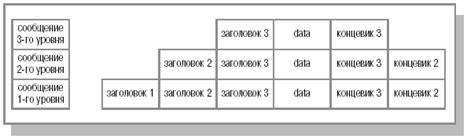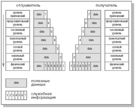 Хотя сегодня существуют разнообразные модели сетей, большинство разработчиков придерживается именно этой общепризнанной схемы. Рассмотрим процесс передачи информации между двумя компьютерами. Программное обеспечение формирует сообщение на уровне 7 (приложений), состоящее из заголовка и полезных данных. В заголовке содержится служебная информация, которая необходима уровню приложений адресата для обработки пересылаемой информации (например, это может быть информация о файле, который необходимо передать, или операции, которую нужно выполнить). После того, как сообщение было сформировано, уровень приложений направляет его "вниз" на представительский уровень (layer 6). Полученное сообщение, состоящее из служебной информации уровня 7 и полезных данных, для уровня 6 представляется как одно целое (хотя уровень 6 может считывать служебную информацию уровня 7). Протокол представительского уровня выполняет необходимые действия на основании данных, полученных из заголовка уровня приложений, и добавляет заголовок своего уровня, в котором содержится информация для соответствующего (6-го) уровня адресата. Полученное в результате сообщение передается далее "вниз" сеансовому уровню, где также добавляется служебная информация. Дополненное сообщение передается на следующий транспортный уровень и т.д. на каждом последующем уровне (схематично это представлено на рис. 1). При этом служебная информация может добавляться не только в начало сообщения, но и в конец (например, на 3-м уровне, рис. 2). В итоге получается сообщение, содержащее служебную информацию всех семи уровней.