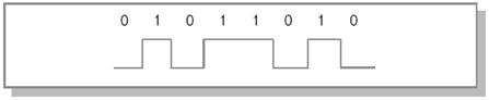 Процесс "обертывания" передаваемых данных служебной информацией называется инкапсуляцией (encapsulation). Далее это сообщение передается через сеть в виде битов. Бит – это минимальная порция информации, которая может принимать значение 0 или 1. Таким образом, все сообщение кодируется в виде набора нулей и единиц, например, 010110101. В простейшем случае на физическом уровне для передачи формируется электрический сигнал, состоящий из серии электрических импульсов (0 - нет сигнала, 1 - есть сигнал). Именно эта единица принята для измерения скорости передачи информации. Современные сети обычно предоставляют каналы с производительностью в десятки и сотни Кбит/с и Мбит/с. Получатель на физическом уровне получает сообщение в виде электрического сигнала (рис. 3). Далее происходит процесс, обратный инкапсуляции,– декапсуляция (decapsulation). На каждом уровне происходит разбор служебной информации. После декапсуляции сообщения на первом уровне (считывания и обработки служебной информации 1-го уровня) это сообщение, содержащее служебную информацию второго уровня и данные в виде полезных данных и служебной информации вышестоящих уровней, передается на следующий уровень. На канальном (2-м) уровне снова происходит анализ системной информации и сообщение передается на следующий уровень. И так до тех пор, пока сообщение не дойдет до уровня приложений, где в виде конечных данных передается принимающему приложению.
