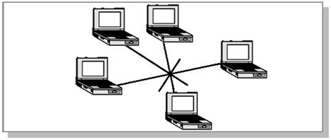 Кольцо состоит из сетевых устройств и кабелей между ними, образующих одно замкнутое кольцо. Топология "звезда" показана на рис. 6.