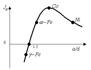 обменный интеграл является положительным и, следовательно, из переходных металлов группы железа ферромагнетизмом должны обладать железо, кобальт и никель, что и наблюдается в действительности.