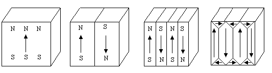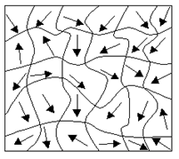 Большинство ферромагнитных материалов макроскопических размеров не обнаруживает намагниченности в отсутствие внешнего магнитного поля. Это объясняется тем, что обычно образец состоит из большого числа малых областей – доменов, намагниченных до насыщения, но векторы намагниченности этих областей ориентированы хаотически (рис. 5.17). Полная намагниченность такой системы, как правило, оказывается равной нулю, потому что векторы намагниченности доменов компенсируют друг друга при суммировании по всему образцу.