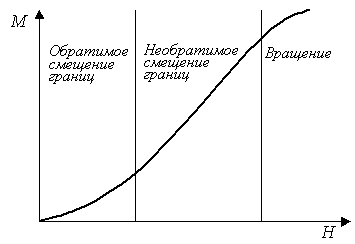 Если размагниченный образец поместить в слабое магнитное поле, то в нем появится результирующая намагниченность, направленная вдоль поля. Намагничивание будет происходить за счет сдвига границ доменов (рис. 5.18, б) и поворота векторов намагниченности доменов в направлении внешнего поля (рис.5.18, в). Рост намагниченности за счет сдвига границ доменов происходит уже при сравнительно слабых полях. Этот процесс в малых полях обратим. Рост намагниченности за счет вращения наблюдается в сравнительно сильных полях. Типичная кривая намагничивания представлена на рис. 5.19.